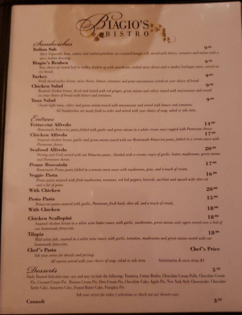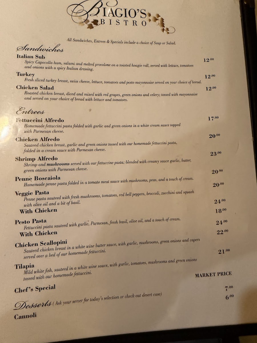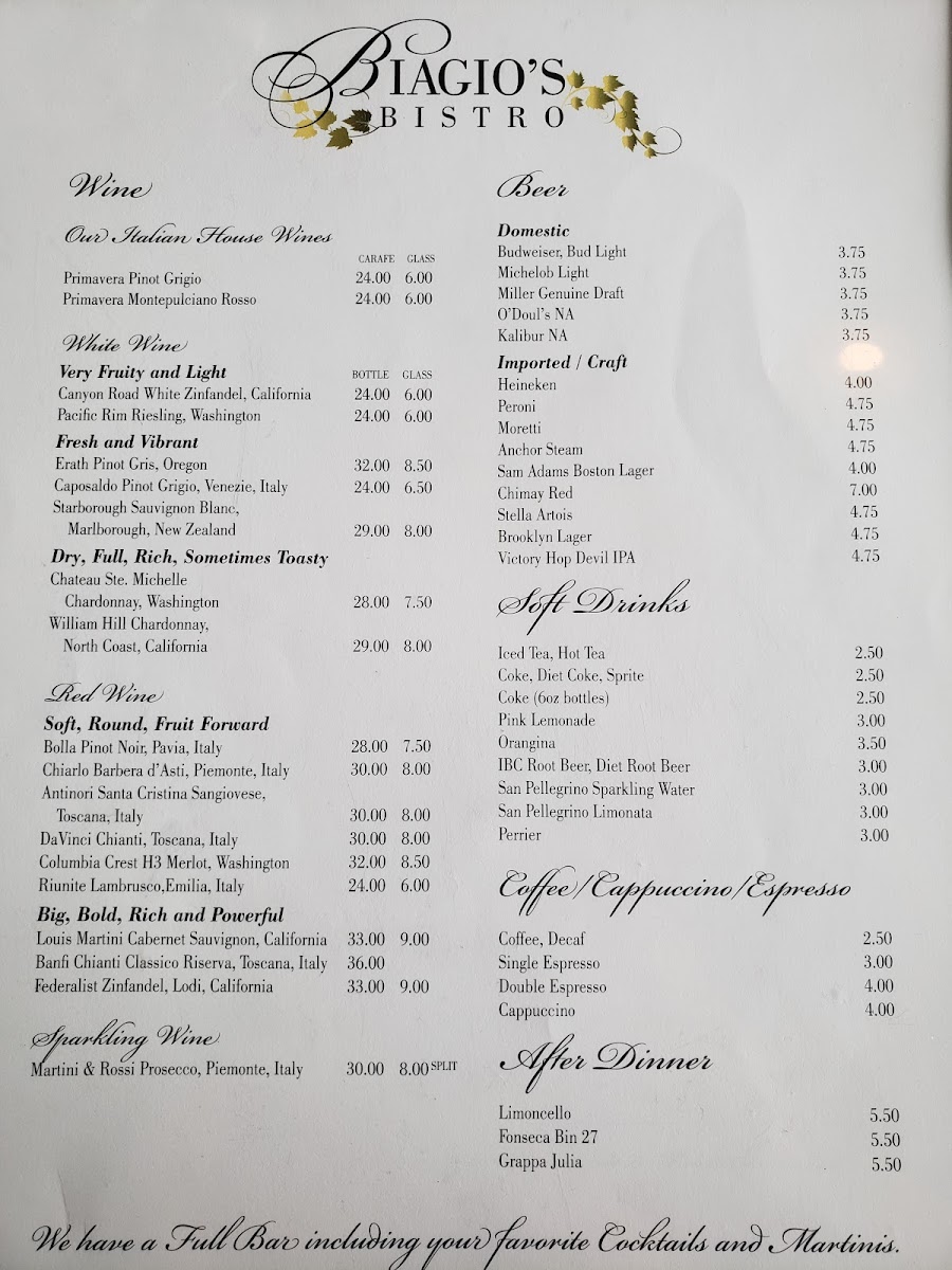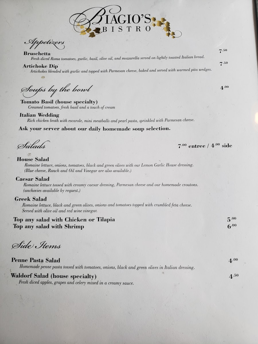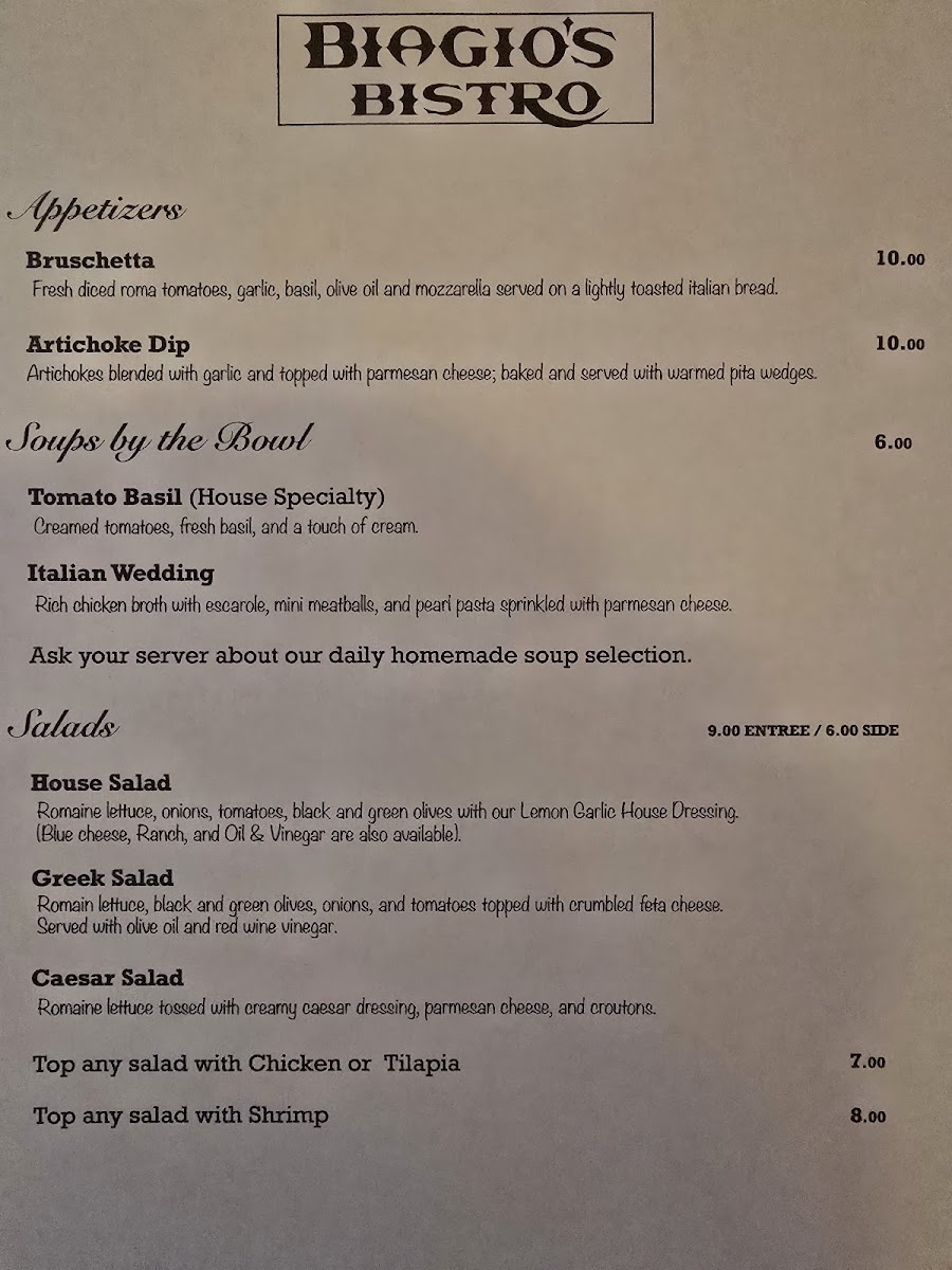 Biagio's Bistro offers a thoughtfully curated menu that reflects the comforting and authentic spirit of Italian cuisine. The selection feels approachable, with classic dishes and familiar favorites served in a warm, inviting atmosphere. Whether you're stopping in for a leisurely lunch or settling in for a relaxed dinner, the menu’s range of appetizers, pastas, salads, and desserts complements the intimate, welcoming setting of this neighborhood favorite.